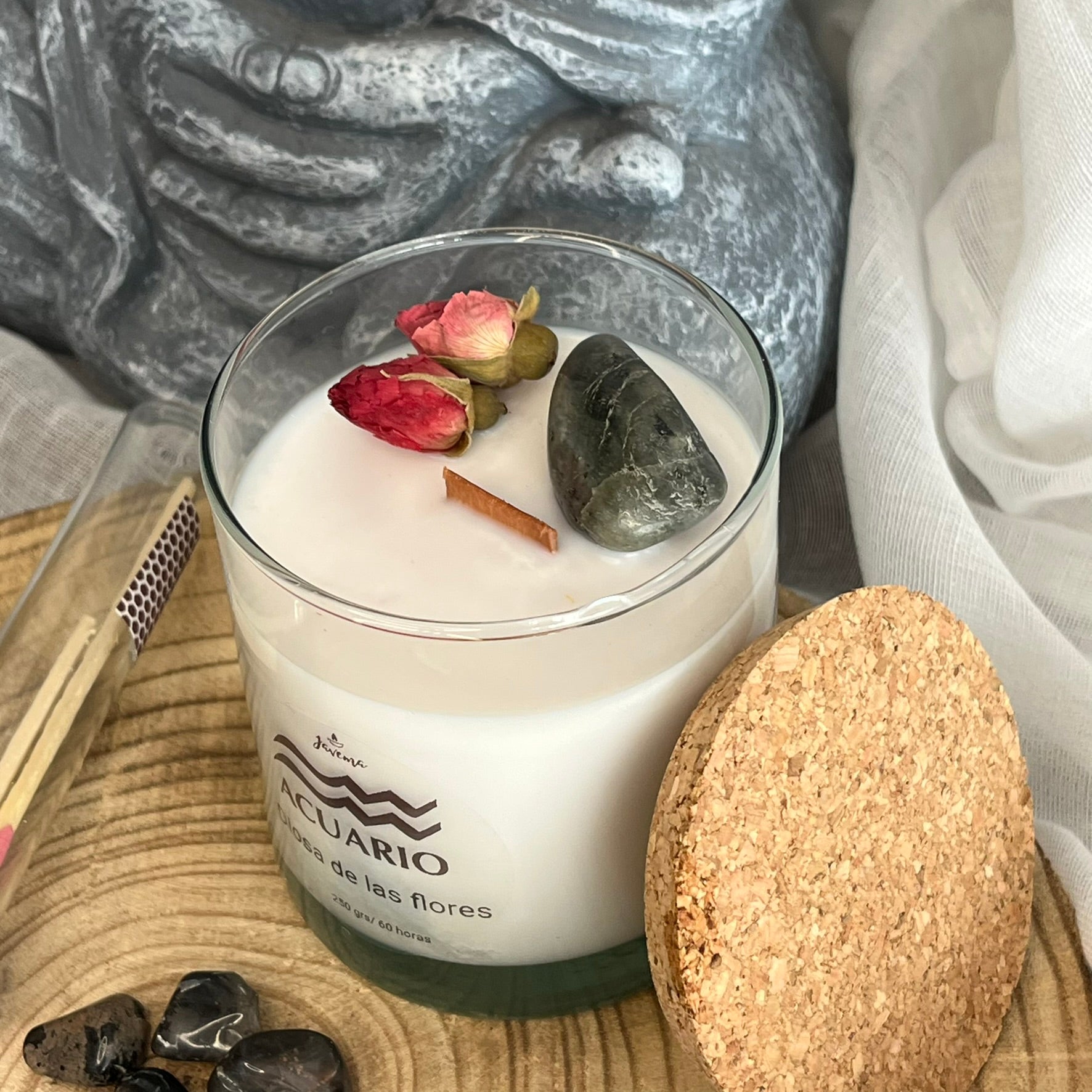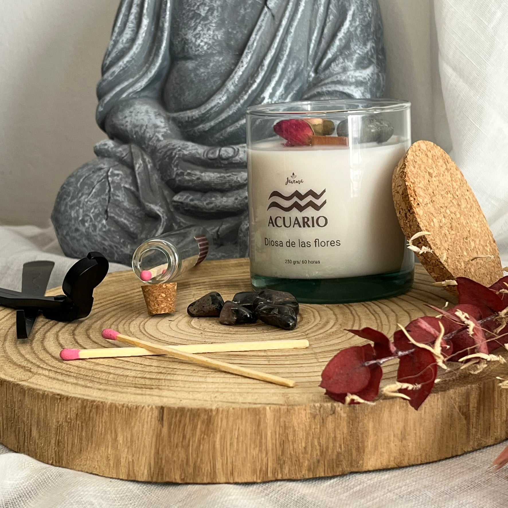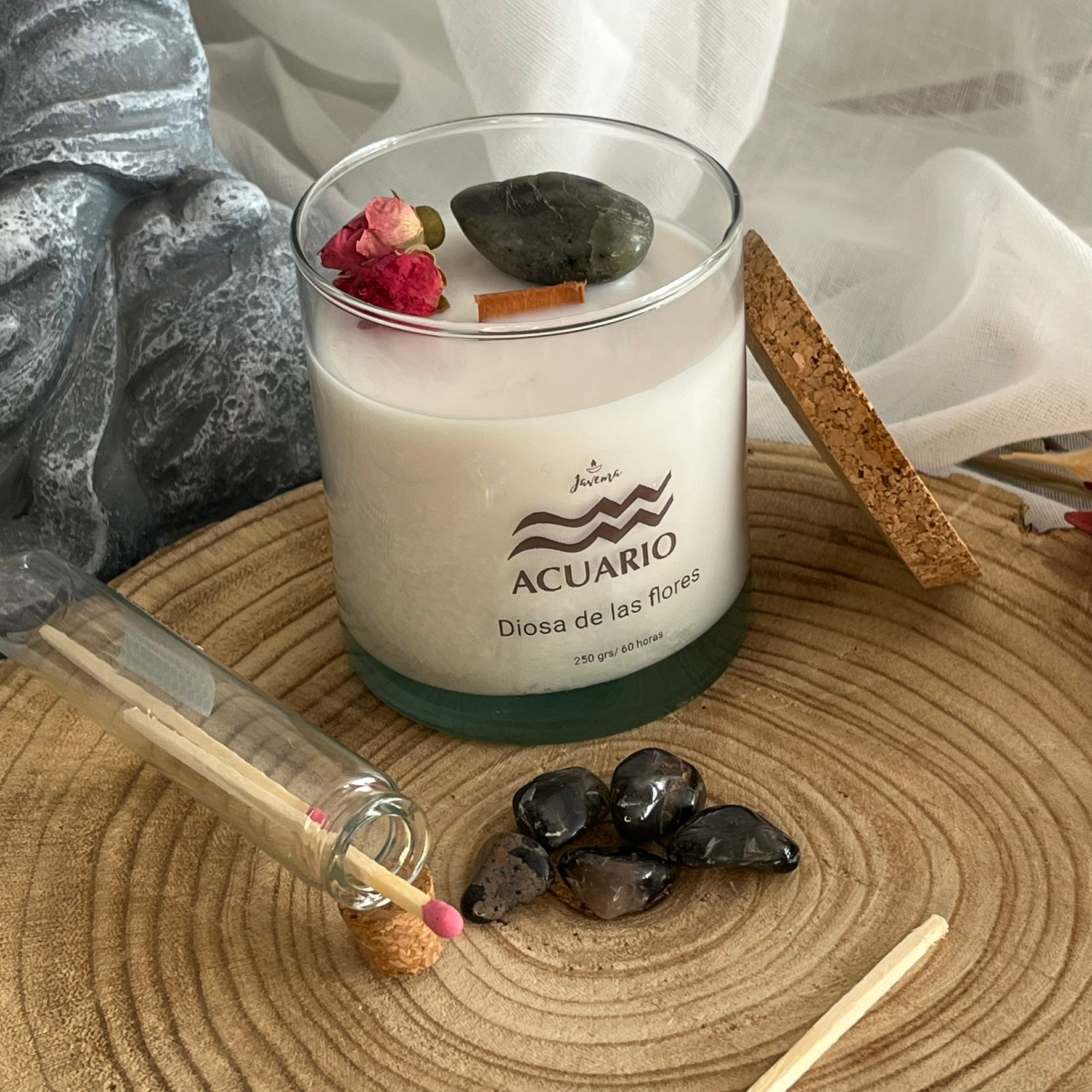 El mineral correspondiente al signo, presente en la vela, potencia la claridad, la creatividad y la conexión interior, reflejando la energía visionaria y auténtica de Acuario.