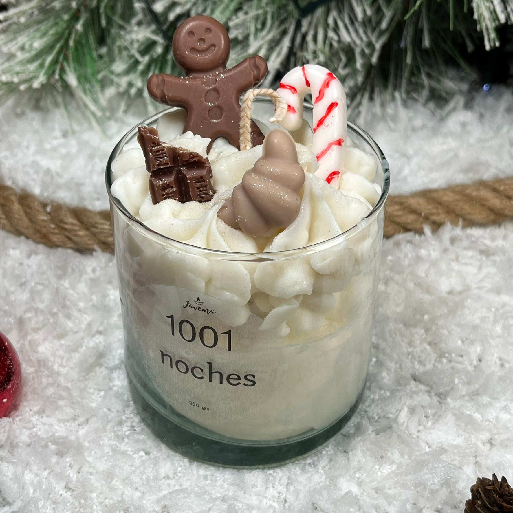 Elaborada en envase de vidrio reciclado y hecha completamente a mano, esta vela contiene 250 g de cera de soja, decorada con una capa cremosa coronada por pequeñas figuras navideñas: un muñeco de jengibre, una casita de chocolate, una nube dulce y un bastón de caramelo que transforman la superficie en un pequeño universo festivo.