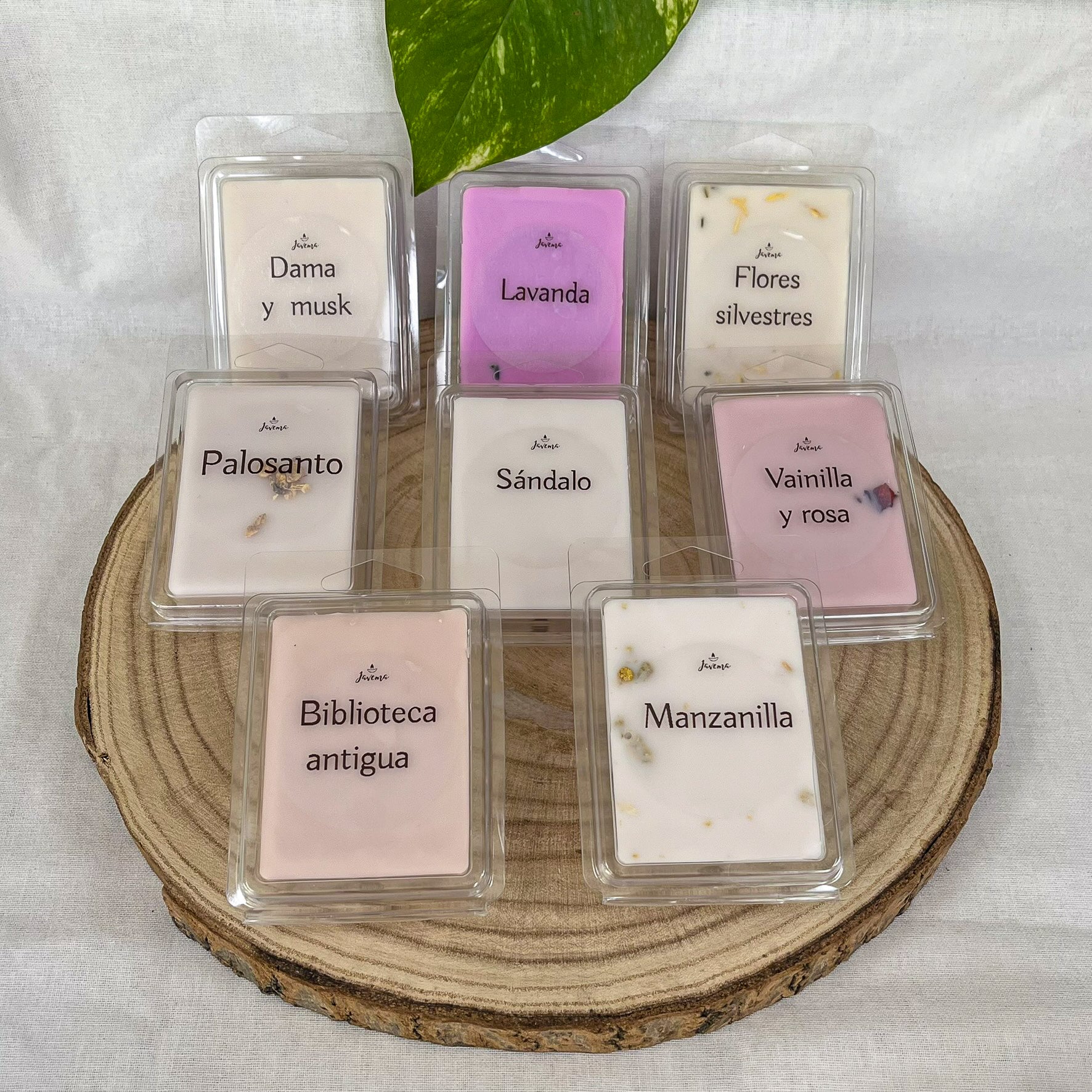 Elaborados con cera de soja 100% vegetal y vegana, en color lila y decorados con flores de lavanda que refuerzan su carácter natural y artesanal. Su formato en cubos permite dosificar fácilmente la intensidad del aroma en quemadores de cera.